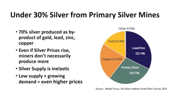 Only around 30% of annual supply comes from primary silver mines. Over two-thirds is sourced from polymetallic ore deposits, including lead/zinc operations and copper mines.