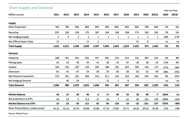 “Overall, the silver market is expected to record a physical deficit in 2021, albeit modestly. At 7Moz, this will mark the first deficit since 2015.”