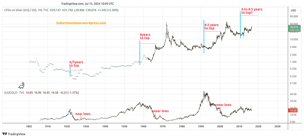 Once in the bull market, significant silver peaks occurred within 8.5 years, as measured from the Dow/gold ratio peak (marked in red), with the Great Depression silver peak occurring the soonest (6 to 7 years after).