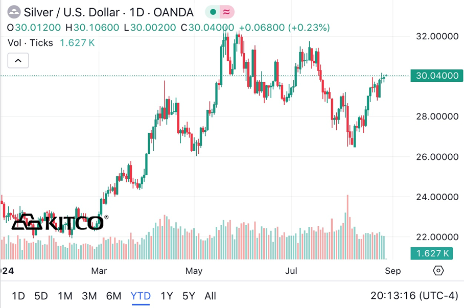 According to Sprott Money, a breakout is coming because silver cannot continue to be so undervalued compared to gold. Using a median gold-silver ratio of 80:1 (80 ounces of silver to buy one ounce of gold), a gold price of $2,300 implies a silver price of $28.75. If gold reaches $2,500, as it has, maintaining that same ration means $31.25 silver.