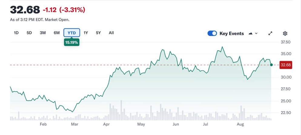 Last week the metal followed gold higher, breaking through $30/oz. So far this year it is up 28% compared to gold’s 23%.