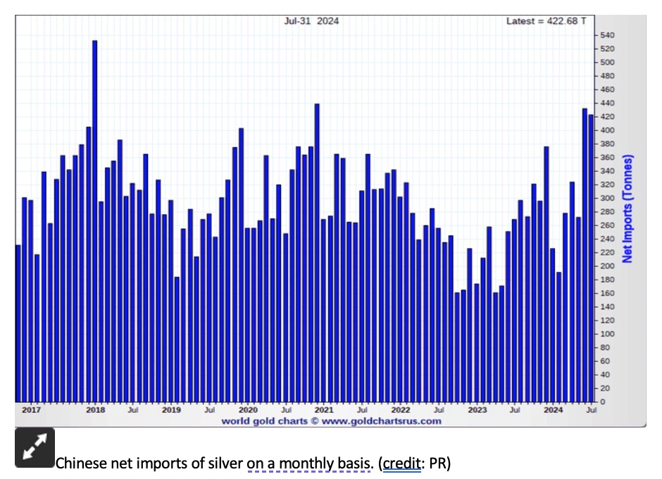 Bloomberg reports that China’s silver imports reached a three-year high of 390 tons in December and 340 tons in April, compared to the monthly five-year average of 310 tons. In June and July, net silver imports surpassed 400 tons.