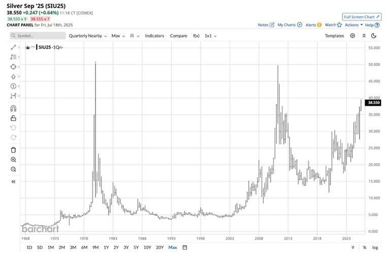 “The bottom line is that tariffs and silver’s bullish trend could attract a herd of speculative buying, causing silver prices to rise, perhaps substantially, past the 1980 peak,” Barchart writes.