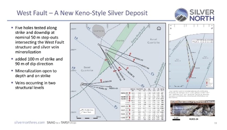 Silver North’s goal was to find Keno-type mineralization and at least 300 grams-per-tonne rock over a comfortable mining width of 4 meters. They achieved that with the West Fault discovery of 311 g/t Ag over 8.7m.