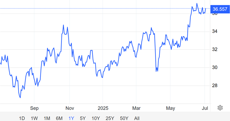 Silver is up 26% year to date and at 92:1, the silver-gold ratio is higher than the 50-60:1 historical average, suggesting a further rise in the price to reach the natural ratio is likely.