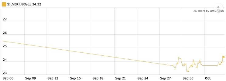 The white metal saw a significant decline in September, falling from a $29 per ounce peak to a trough below $23. Like gold, silver has been reacting to a firmer US dollar and an uptick in real yields. After falling as low as 0.52% in early August, the benchmark 10-year Treasury note yield rose to 0.78%, as of Monday, Oct. 5, the latest auction date.
