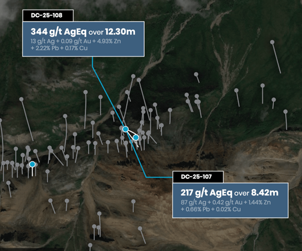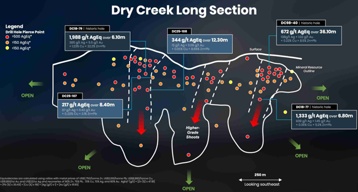 According to the company, the 2025 program targeted untested areas near historical high-grade intercepts to enhance Red Mountain’s inferred 168.6 million silver equivalent ounce resource (336 g/t silver equivalent AgEq) at Dry Creek and West Tundra Flats.