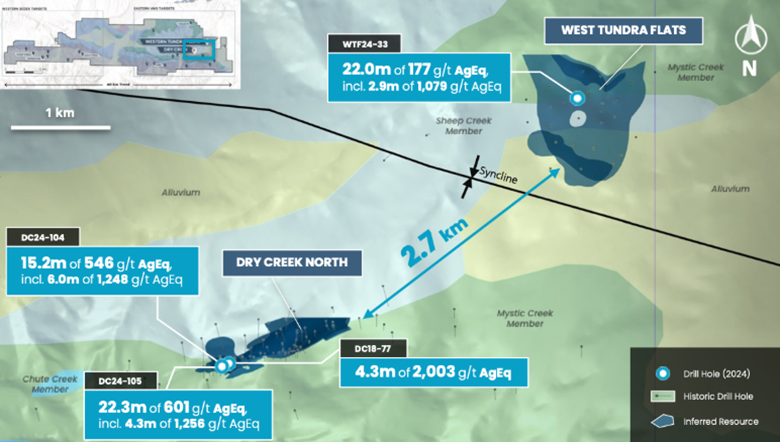 Resource expansion: The 2025 summer program targeted untested areas near historical high-grade intercepts to enhance Red Mountain’s inferred 168.6 million silver-equivalent-ounce resource at Dry Creek and West Tundra Flats. Both the West Tundra Flat and Dry Creek deposits remain open along strike and down-dip, with systematic drilling planned to delineate full scale.