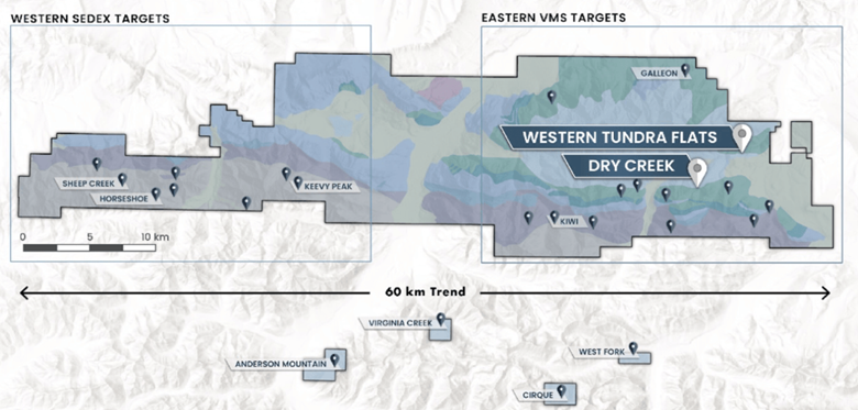 Eight holes were sunk at the Dry Creek target and seven holes at West Tundra Flats, intersecting massive, semi-massive and disseminated sulfides in step-out and infill drilling.