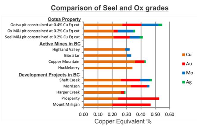 Just before the name change, Gold Reach Resources put out a summary of exploration done to date on the Ootsa property. In all, the re-named company has drilled over 122,066 meters of core and, as explained above, discovered three sources of mineralization, at Ox, East and West Seel. Enough near-surface mineralization has been discovered to construct an NI 43-101-compliant resource estimate of 224 million tonnes, measured and indicated. The resource contains 1.1 billion pounds of copper, a million ounces of gold, together with 104,000 pounds of molybdenum and 20.4 million silver ounces.