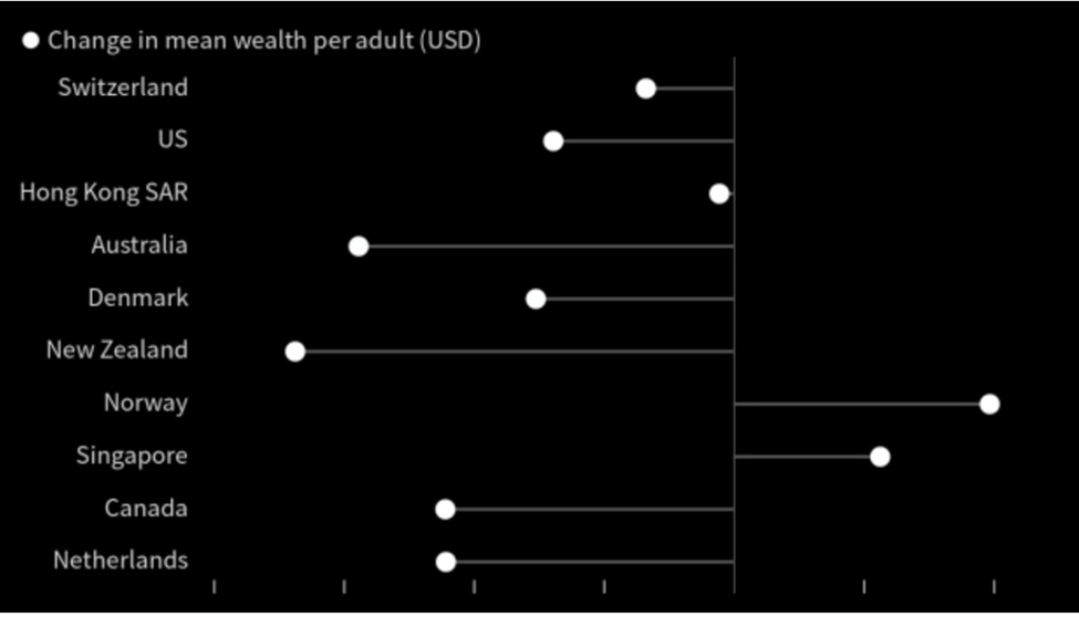 Note in the graphic below that the United States and Canada both saw declines in wealth per adult.