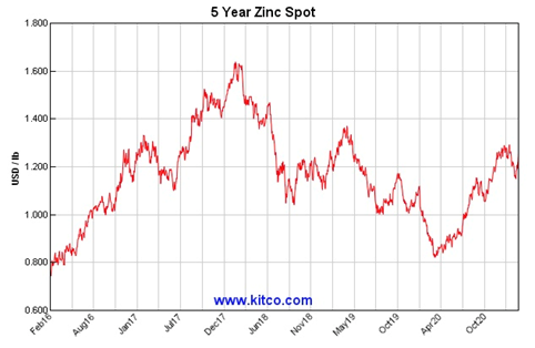 In December the Northern Miner quoted Carlos Sanchez, the CPM Group’s director of commodities and asset management, who forecast zinc to trade at $2,628 per tonne ($1.19/lb) in 2021, up 17% from the average price in 2020. In 2022, the galvanizing metal should rise 8.7% from 2021 prices, to $2,857/t, or $1.29/lb.