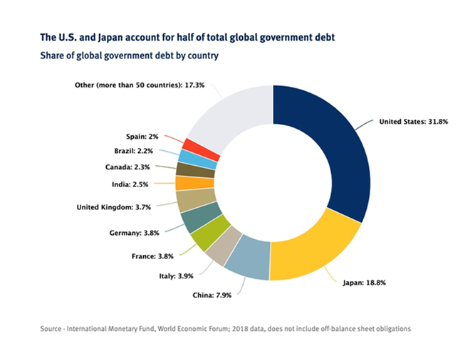 The Canadian bank quoted the IMF in stating that the public debt of advanced economies has climbed nearly 27% since January 2020, and now sits beyond the greater than 120% of GDP reached after World War II. The United States and Japan are the two most indebted economies accounting for half of total global government debt (see the pie chart below).