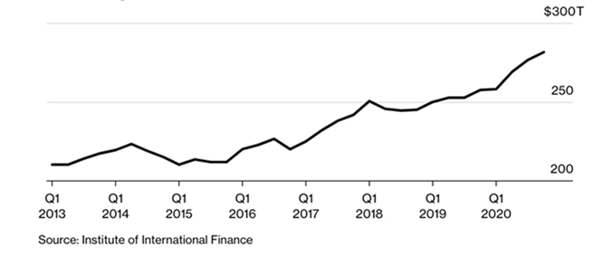 The Institute of International Finance found that governments, companies and households raised $24 trillion last year to offset the pandemic’s economic toll, bringing total global debt to an all-time high, at the end of 2020, of $281 trillion.