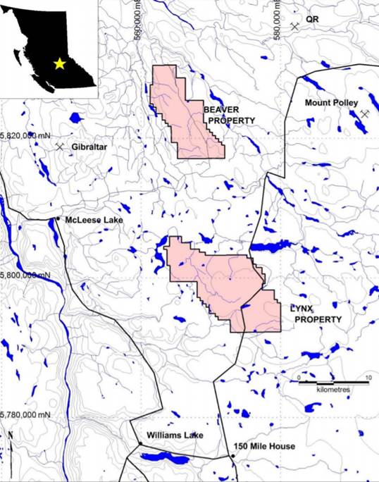The company’s 7,528 hectare Beaver and 12,662 hectare Lynx properties are located between two major BC mines overlying world-class porphyry deposits – Taseko’s Gibraltar mine and Imperial Metals’ Mount Polley. Gibraltar is the second largest open-pit copper mine in Canada.