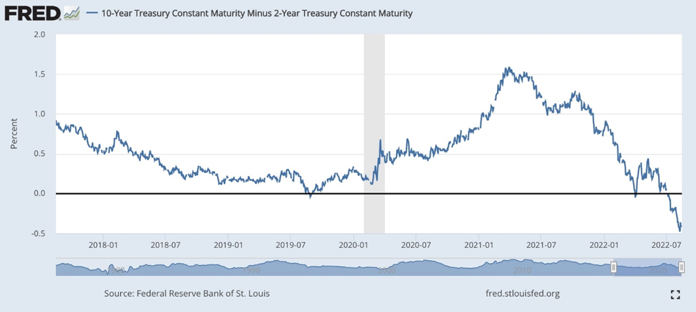 What about the fact that the country’s GDP shrank for the second straight quarter, and that since 1948, the economy has never seen consecutive quarterly growth declines without being in a recession? How about the yield curve inverting? Does anyone at the Fed care that the current 2-year US Treasury yield is higher than the 10-year and the 30-year, the “yield curve inversion” being an extremely reliable recession indicator? The FRED chart below shows the 2-year/ 10-year yield curve in a state of inversion (the blue line below zero) since July 8.