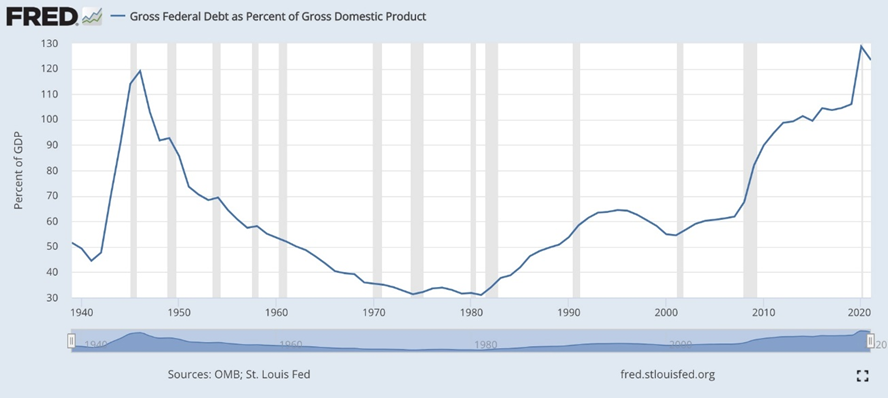 According to the FRED chart below, the US debt to GDP ratio in the ‘70s was around 35%. Today it is three and a half times higher, at 123%.