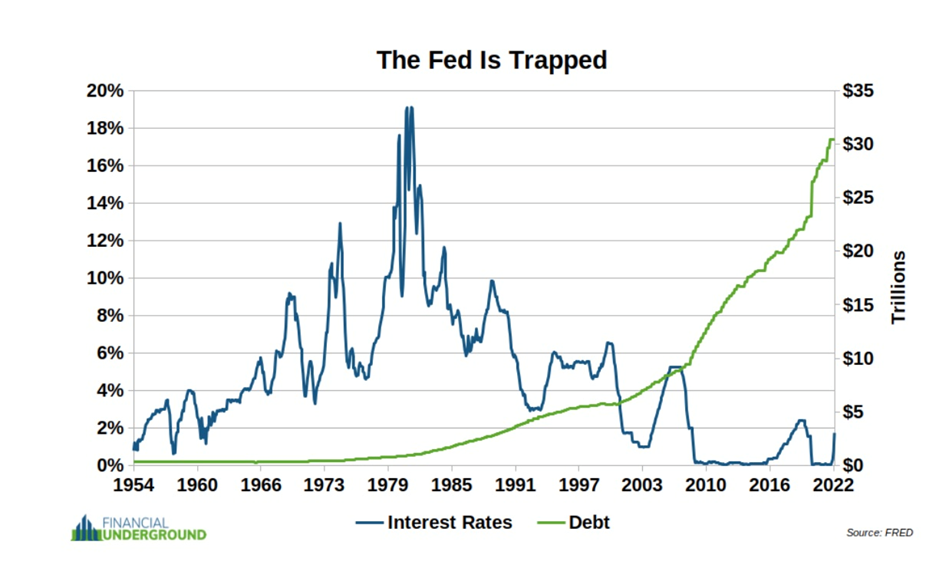 This severely limits how much and how quickly the Fed can raise interest rates, due to the amount of interest that the federal government will be forced to pay on its debt.