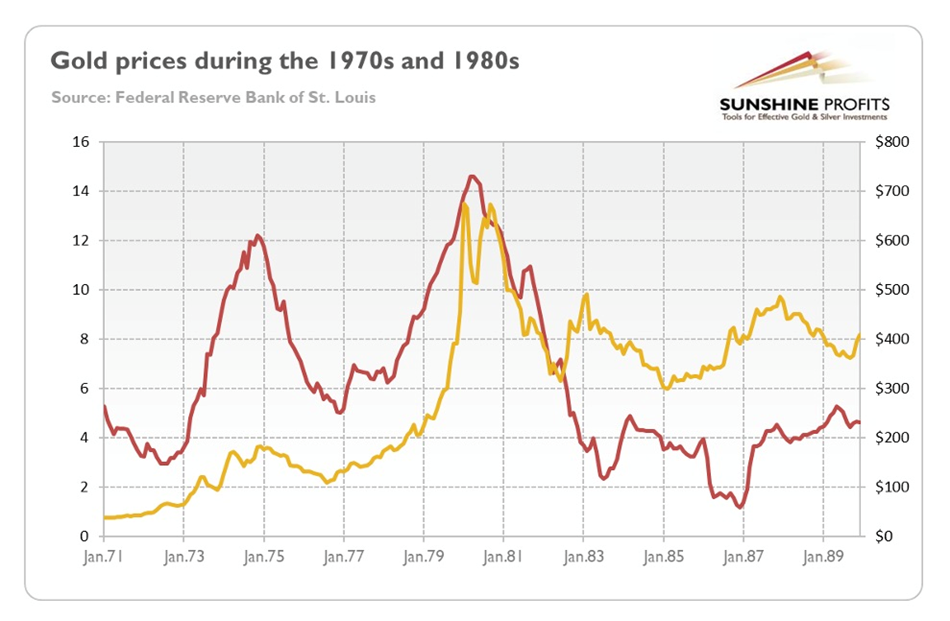 How has gold done during stagflation? As it turns out, quite well. The chart below by Sunshine Profits shows the gold price climbing during the stagflationary 1970s, surging from $100 per ounce in 1976 to around $650 in 1980, when CPI inflation topped out at 14%.
