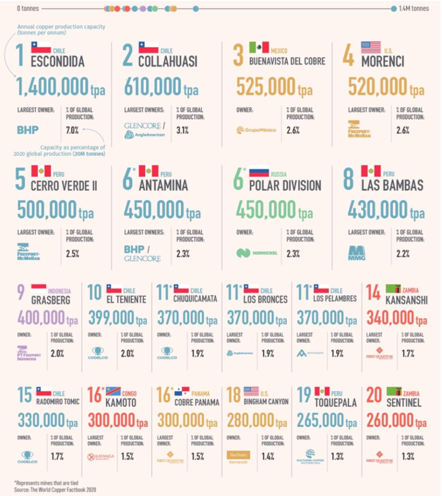 These 20 mines have the capacity to produce nearly 9 million tonnes of copper annually, representing 44% of global production in 2020.