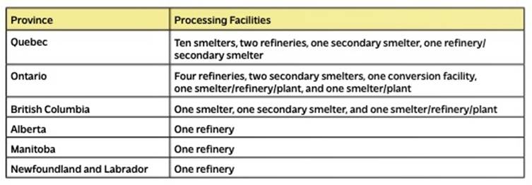 The table below shows Quebec is the nexus of Canadian smelting and refining, with 10 smelters, two refineries, one secondary smelter, and one refinery/secondary smelter.
