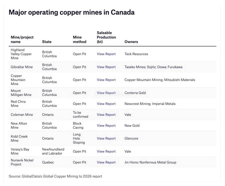 In the table below by GlobalData, via Mining Technology, we note that of 10 major operating copper mines in Canada, six are in BC.