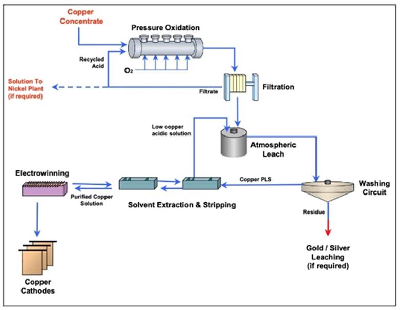 The CESL Process involves oxidation of sulfide concentrates at elevated pressure and temperature in the presence of catalytic chloride ions, within an autoclave. The oxidized copper forms basic copper sulfate (BCS). Copper from the BCS is subsequently leached under mildly acidic conditions at atmospheric pressure and temperature. Copper is recovered from solution by conventional solvent extraction and electrowinning.