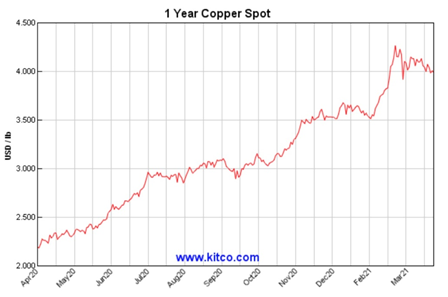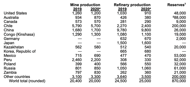 It is interesting to note that, even though in 2020 copper exports to China were surging, along with prices, as the country sopped up millions of pounds of cheap copper rendered less expensive by the pandemic, in the United States copper production actually fell. According to the USGS, output decreased by 5% to an estimated 1.2 million tons. (about a fifth the production of top producer Chile)