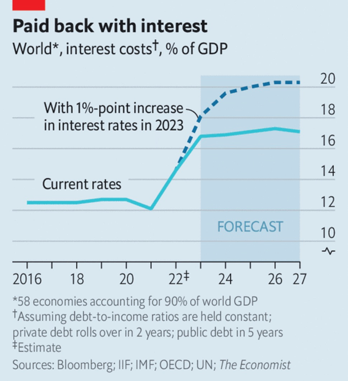 The Economist estimated the interest bill for companies, households and governments across 58 countries, representing over 90% of global GDP, in 2021 amounted to $10.4 trillion, or 12% of combined GDP. By 2022 it had reached $13 trillion, or 14.5% of GDP. A key point is the more indebted the world becomes, the more sensitive it is to interest rate rises.