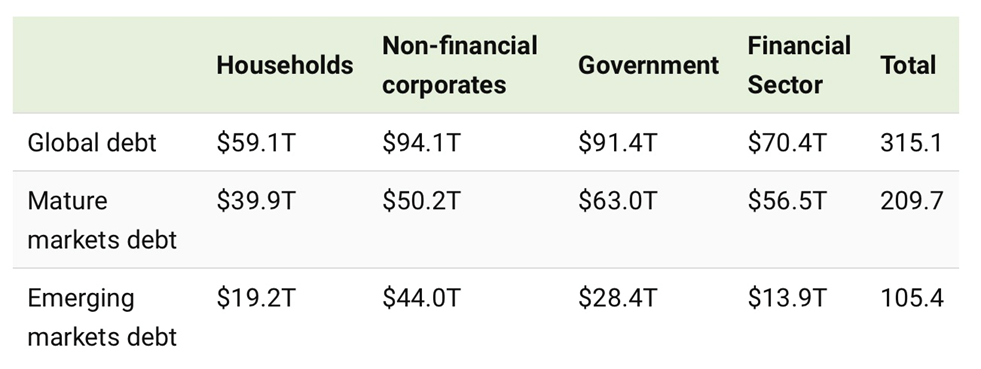Mature markets accounted for $209.7T, about two-thirds of the total, while emerging markets represented $105.4T. Visual Capitalist notes that total global debt increased by 2.6% year on year, with the government sector showing the largest annual increase of 5.8%.