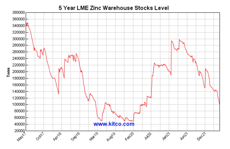 Zinc reportedly moved from a 5.3 million tonne surplus in 2020 to a million-tonne deficit in 2021, with warehoused metal in London and Shanghai recently plummeting to six days consumption. According to Shanghai Metals Market, zinc inventories in China have been drawn down due to curbs announced by the Chinese government to tackle the pandemic that has resurfaced there.