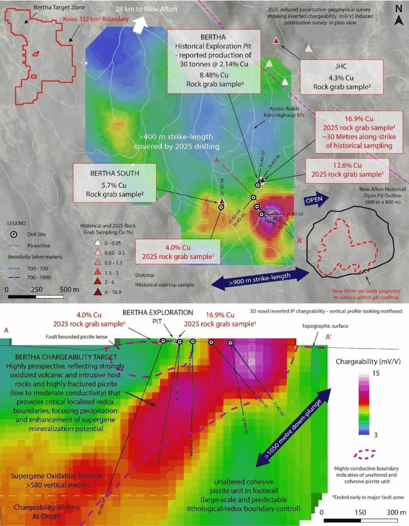 “The Bertha Zone represents a highly prospective, underexplored high-grade copper target where recent fieldwork has confirmed supergene-style copper mineralization, primarily sooty chalcocite, native copper, and malachite nodules hosted within brecciated volcanic rocks. This style and setting are geologically significant and comparable to the supergene enrichment zone at New Afton, located just 28 km to the north.”