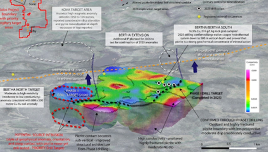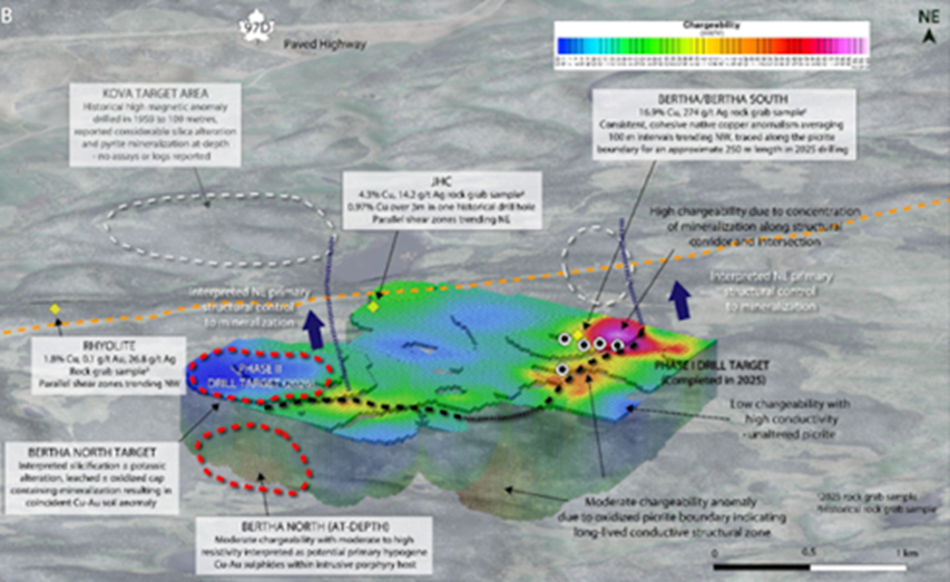 At the Bertha Zone, geophysical work continues to advance the company’s understanding of a large, structurally controlled copper-gold system discovered through inaugural Phase I drilling in late 2025.