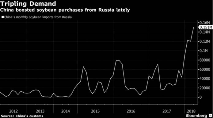 Instead of buying soybeans from the United States, the country turned to Brazil, Russia and Canada instead. In May China bought arecord amount of soybeans from Russia.