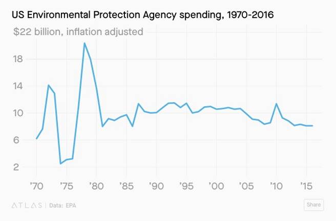 According to research by Quartz, EPA spending fell under Obama to its lowest point since the 1980s, just $8.3 billion in 2015. The agency’s spending was more than double that, during the late 1970s. It has also dropped considerably as a percentage of total government spending: in 2015 it was less than 0.3%.