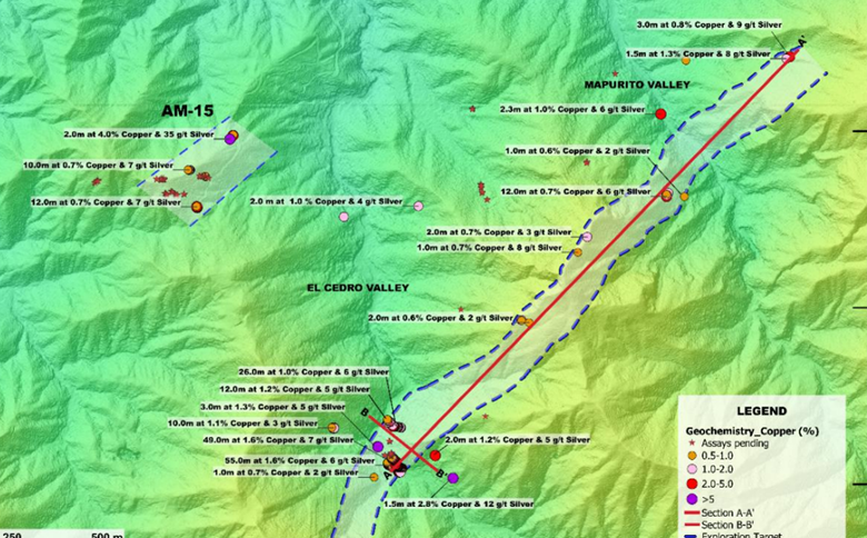 At Conejo located 30-km south of AM-13 is a high priority target with extensive mineralization. Mineralized outcrops have been discovered over 3.7-km at the primary target area. Surface samples averaged 4.9% copper (with a 2% cut-off). The two main areas are 1.3 kilometers apart and there’s been no exploration done in that 1.3 km. We anticipate that the regional geochemistry campaign will develop further targets, preliminary results are due soon.