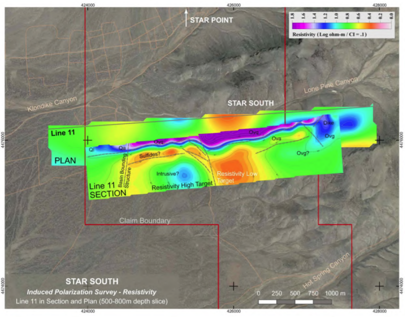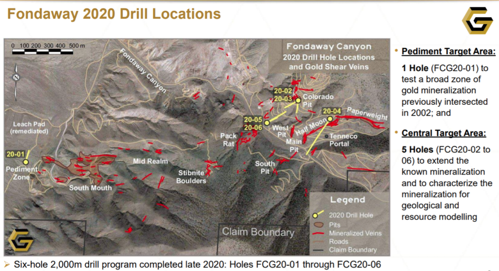 Hole FCG20-02, drilled to the southwest along a plane connecting the Colorado Pit to Pack Rat zone, encountered a wide mineralized structural zone between a drill depth of 150 and 300 metres. The mineralization was encountered where predicted by the geological model and down-dip from the Colorado Zone. Within the breadth of the mineralization encountered, two gold zones are highlighted.