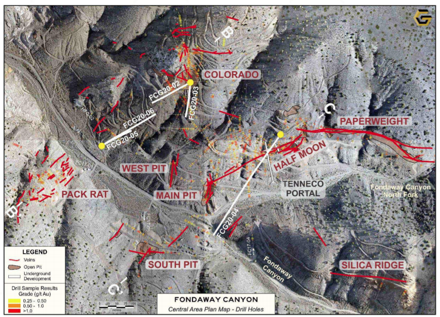 Drill holes FCG20-05 and 06, were collared on the same pad near the canyon floor and drilled to the northeast along a plane connecting the Colorado Pit to Pack Rat zone and on plane with hole FCG20-02. Holes FCG20-05 and 06 were designed test the down-dip extension of the mineralization observed at surface at the historic Colorado Pit and the mineralization encountered in holes FGC20-02 and 03.