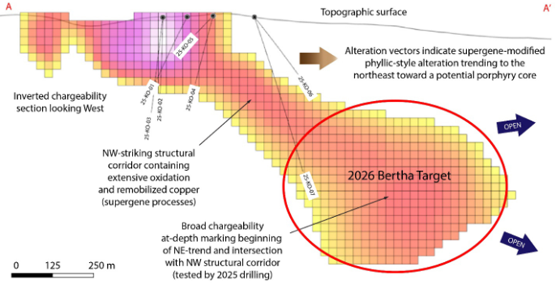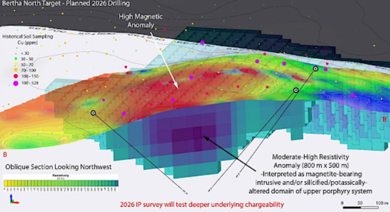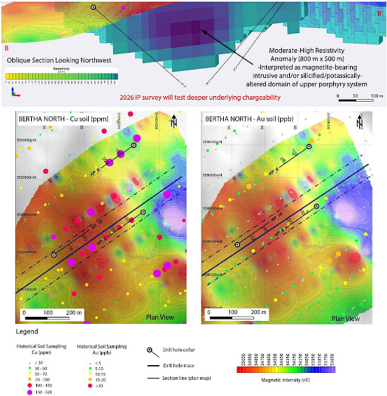 We need to start with the IP geophysics that will test the expansion potential to the northeast of the Bertha Zone where we focused our drilling. That drilling confirmed Bertha as the peripheral expression of a large alkalic porphyry system with a very extensive supergene-style mineralization alteration within it.