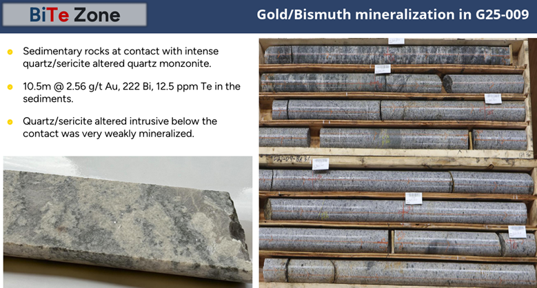You can see the bismuth disseminated in the intrusive where we have that intense quartz sericite alteration. But was the BiTe Zone the less to that degree? No. We get the results and we still are getting 300-400 ppm in the bismuth and that comes in with 0.08 gold in that quartz sericite zone.