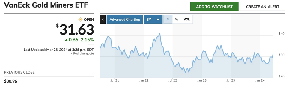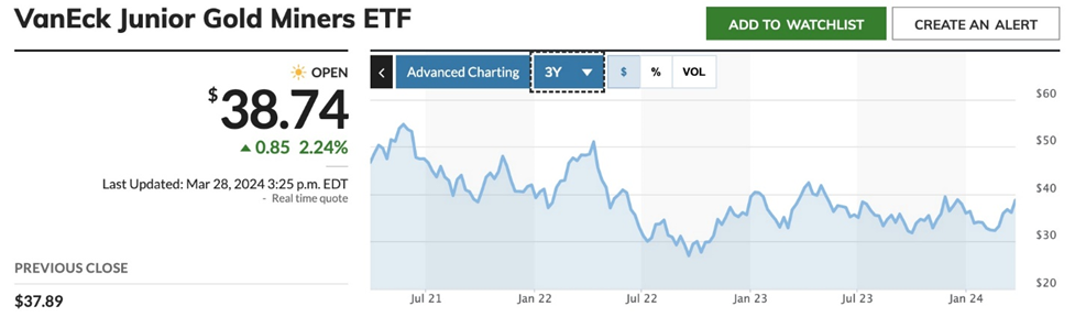 Large-cap gold mining stocks, represented by the VanEck Gold Miners ETF (GDX) are down 2% over the past year; junior gold miners’ stocks, represented by the VanEck Junior Gold Miners ETF (GDXJ) are down 1.17% over the same period.