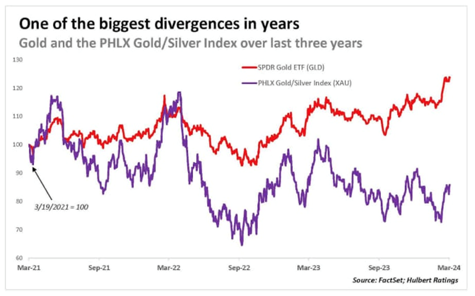 MarketWatch columnist Mark Hulbert analyzed what happened in the wake of large divergence between gold and gold-mining shares using data going back to the mid-1980s.