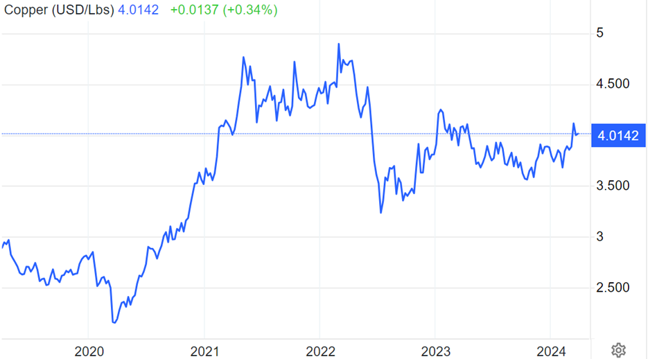 A couple of factors identified by us at AOTH indicate that 2024 will be a great year for copper. Most important is supply failing to keep up with demand. The second factor is a weakening of the US dollar if market expectations of monetary easing come to pass.