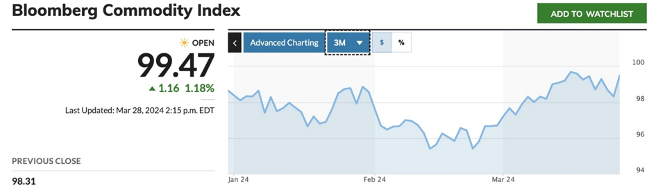 The two charts below are bullish on copper and commodities in general. The Global X Copper Miners ETF (COPX) has gained 24% since Feb. 13, with the Bloomberg Commodity Index advancing 3%.