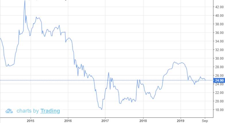 While the mine closures kicked up the price of uranium in 2018, they haven’t been enough to build momentum. Spot uranium finished last year up just over 20%. Year to date 2019, triuranium octoxide, or U3O8, is down a disappointing 11.9%, trading at $25.10 per pound, as of Sept. 11.