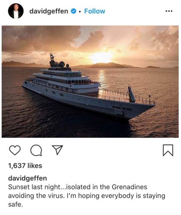 Last week there was outrage on social media when billionaire tycoon David Geffen, co-founder of Dreamworks, posted photos on Instagram of the $590 million yacht he is “quarantined” on. His “stay safe” message below drips with sanctimony:
