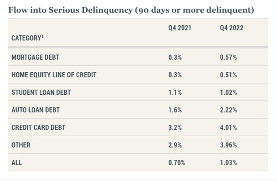 Perhaps the most frightening number to come out of the report is the rise in delinquent debt. This is debt that is no longer being serviced. According to the report, the share of debt becoming delinquent increased in the fourth quarter for nearly all debt types. This bucks a two-year trend of historically low delinquency transitions.