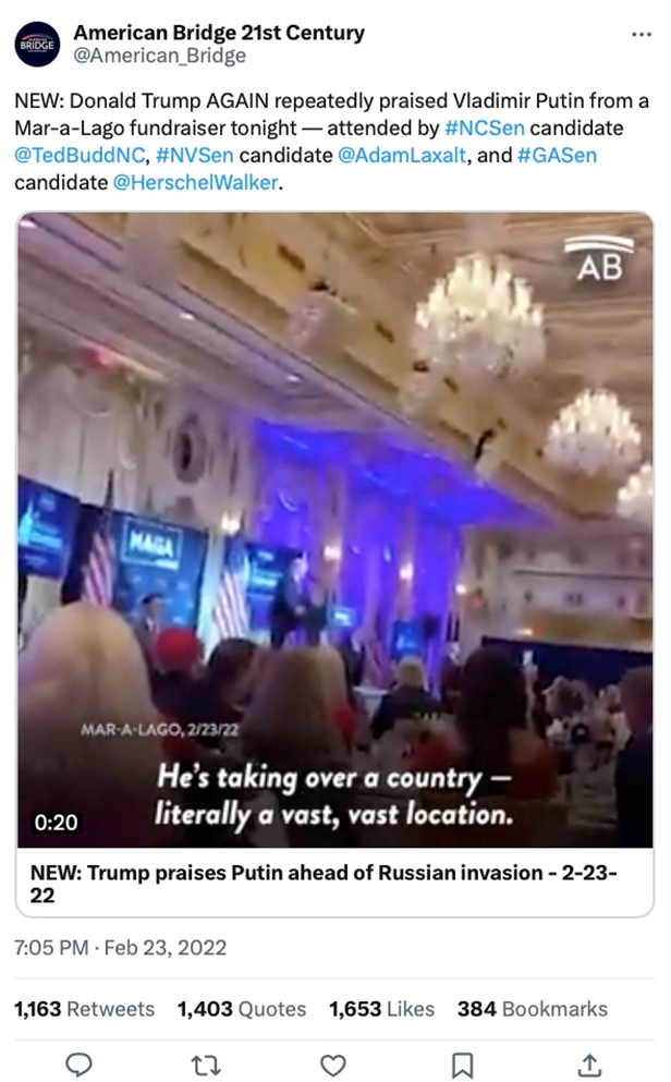 While Trump is now out of power, on the sidelines he tacitly supports Russia viz a viz its war in Ukraine.