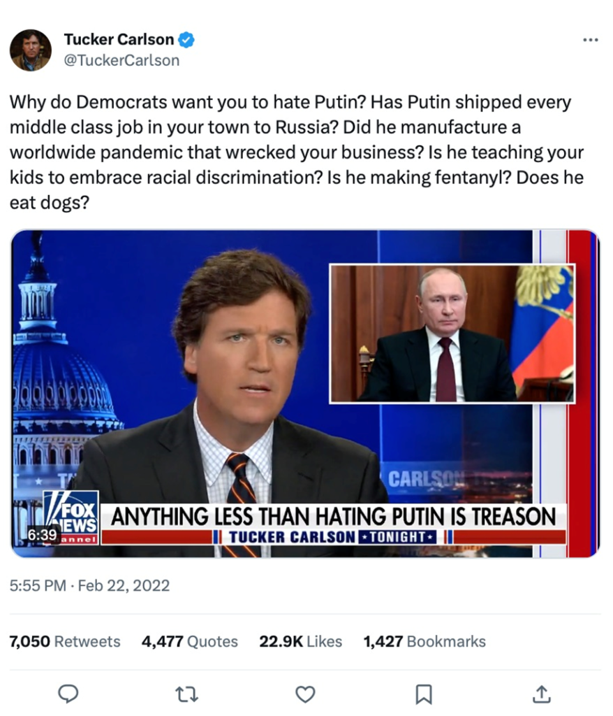 “Why do Democrats want you to hate Putin?” Carlson tweeted in early 2022. “Has Putin shipped every middle-class job in your town to Russia? Did he manufacture a worldwide pandemic that wrecked your business? Is he teaching your kids to embrace racial discrimination? Is he making fentanyl? Does he eat dogs?”