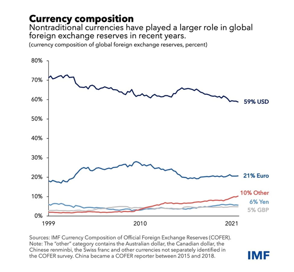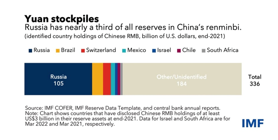 Russia and China have both made moves to de-dollarize and set up new platforms for banking transactions outside of SWIFT that skirt US sanctions. The two nations share the same strategy of diversifying their foreign exchange reserves, encouraging more transactions in their own currencies, and reforming the global currency system through the IMF.